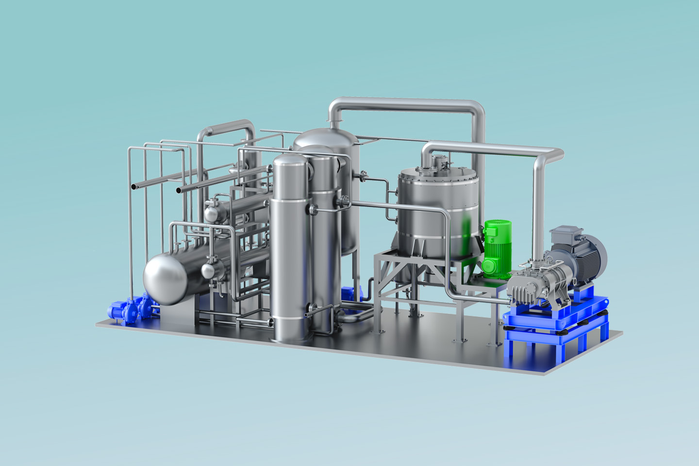 MVR熱泵精餾系統以高效旋轉精餾床為基礎,利用離心力場代替重力場,強化相與相之間的相對速度和相互接觸,通過強化傳質傳熱來提高分離效率縮小設備體積。 通過在系統中引入適用于小流量、大壓比的螺桿式蒸汽壓縮機,即可實現MVR循環(huán)熱泵精餾。